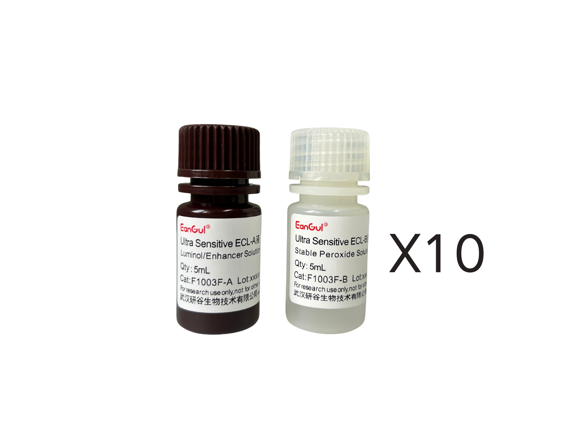 特超敏 ECL 化学发光底物试剂盒是一种用于检测免疫印迹膜上辣根过氧化物酶(HRP)的高灵敏的增强底物。本品 是目前公司灵敏度最高的化学发光底物。在同行业领域也算是灵敏度最高的荧光 ECL 检测试剂,具有极高灵敏度和高信 噪比。可实现低飞克级别抗原检测,适合低丰度蛋白,抗体效价低或比较珍贵的样本检测。该反应产生延长的化学发 光,其可在 X 射线胶片或成像系统上可视。