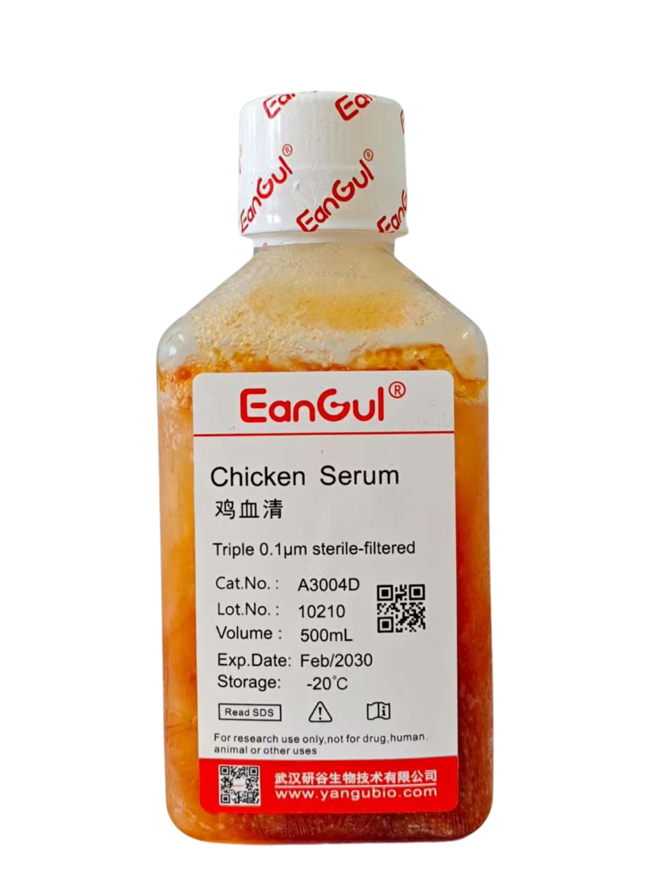 鸡血清是从健康鸡血液中分离的淡黄色透明液体,经离心去除血细胞和纤维蛋白原后制成。 本品经无菌采集、混合后通过3次0.1μm过滤分装,不含人为添加成分。 富含蛋白质(6.5%-8.5%),包括白蛋白、球蛋白及低分子量蛋白(如免疫球蛋白);脂类、氨基酸、无机盐及多种酶类(如胆碱酯酶、淀粉酶)。